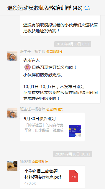 自今年8月7日培训班开班后的70天学习过程中,为了最大程度提高学员学习的自觉性和主动性,班主任老师为学员制定了一整套督学服务:每天由专职辅导教师和班主任在群内答疑;组织学员使用小程序在线题库刷题备考;每周四在学习群内发布练习题,周五发布习题解析;每周向学生提供本周学习进度报告,督促学员按时完成学习任务;组织进行笔试模拟考试,形成个人学习报告。